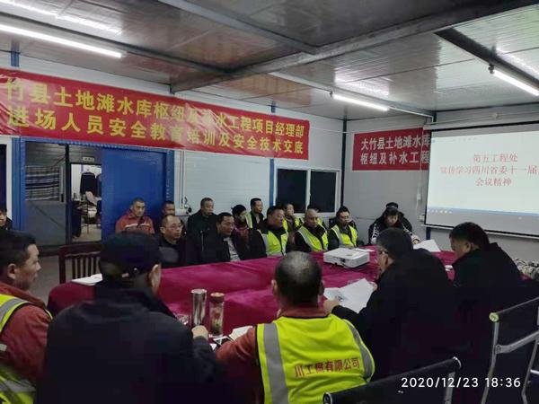 2020年12月23日,第五工程處在承建的大竹縣土地灘水庫樞紐及補(bǔ)水工程項(xiàng)目部召開職工大會(huì),宣傳學(xué)習(xí)四川省委十一屆八次全會(huì)精神和周永開等全國優(yōu)秀共 產(chǎn) 黨員先進(jìn)事跡及中共中央、國務(wù)院關(guān)于表彰全國勞動(dòng)模范和先進(jìn)工作者的決定。會(huì)議由第五工程處處長陳道剛主持。