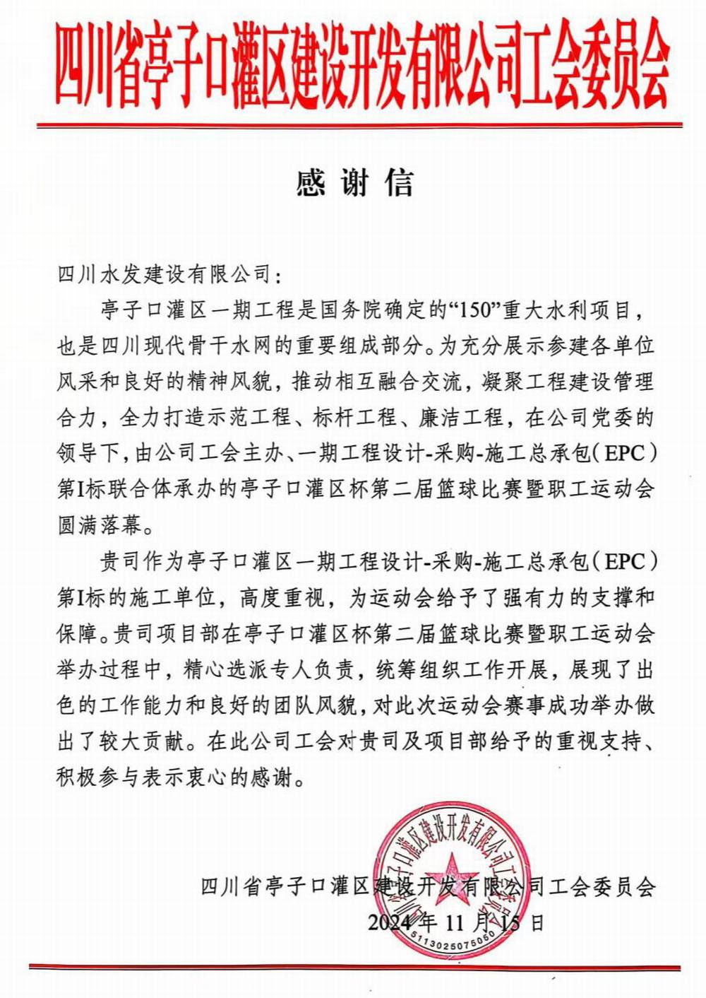 近日,公司收到來(lái)自四川省亭子口灌區(qū)建設(shè)開(kāi)發(fā)有限公司發(fā)來(lái)的感謝信,對(duì)公司亭子口項(xiàng)目協(xié)助圓滿承辦亭子口灌區(qū)杯第二屆籃球比賽暨職工運(yùn)動(dòng)會(huì)活動(dòng)表示誠(chéng)摯感謝。