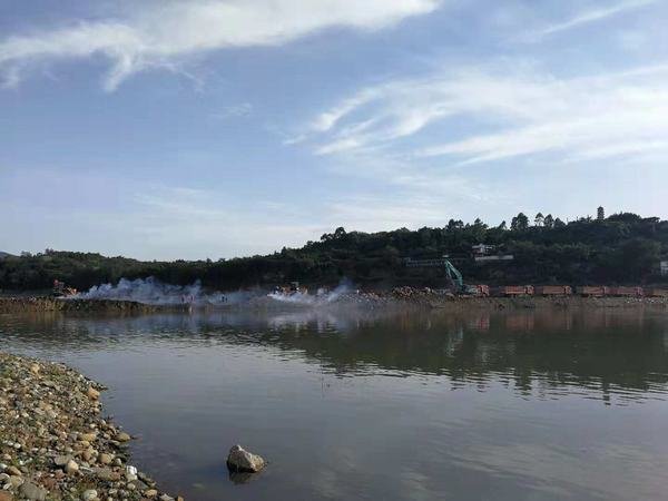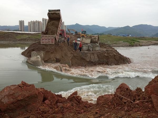 10月9日17:00時,伴隨著機械的轟鳴聲,金堂縣沱江盤龍寺攔河閘工程右岸二期上游圍堰順利完成合攏。