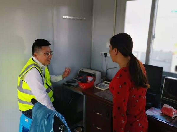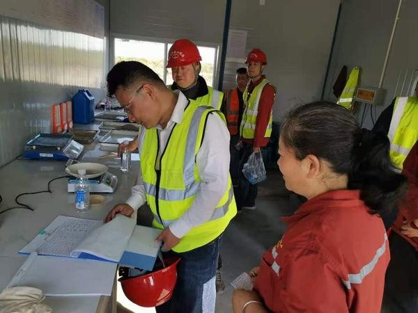 唐驚濤一行到達工地后,隨即徒步到正在施工的廠房、閘壩基坑、拌合站地弄、篩分站凈化池,河道浚挖等工作面進行詳細的踏勘、詢問。在一期導流圍堰上,向陪同人員詢問了解工程設備和人員的投入情況、圍堰施工質量、各節點工期目標實現情況。在地磅房、電工班、實驗室,分別和職工親切交談,了解職工的工作情況、收入情況,勉勵職工立足崗位,加強業務知識學習,不斷提升工作技能,掌握新工藝、新技術的應用,適應新的時代背景下的工作環境,為公司的發展做出更大的貢獻。同時,職工對公司領導的關心和親切慰問表示感謝,愿在崗位上努力奉獻。
