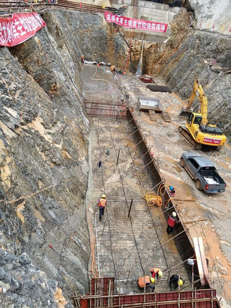 龍塘水庫及灌區工程于2021年5月19日正式開工,龍塘項目部克服征地移民、動力線路拆遷、炸藥手續審批、氣候條件差等問題,在公司的堅強領導下,在確保安全和工程質量的前提下、龍塘項目部全體職工通過不懈努力,按期完成了大壩壩基開挖、副壩開挖、圍堰填筑、滑坡體開挖等施工項目,并于2022年7月20日順利實現大壩主壩首倉混凝土澆筑。主壩首倉混凝土的順利開倉澆筑,為順利完成龍塘項目的年度目標跨出了堅實的一步。