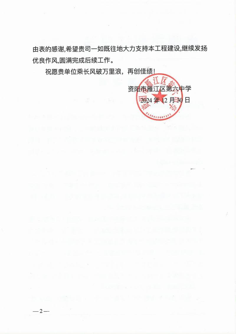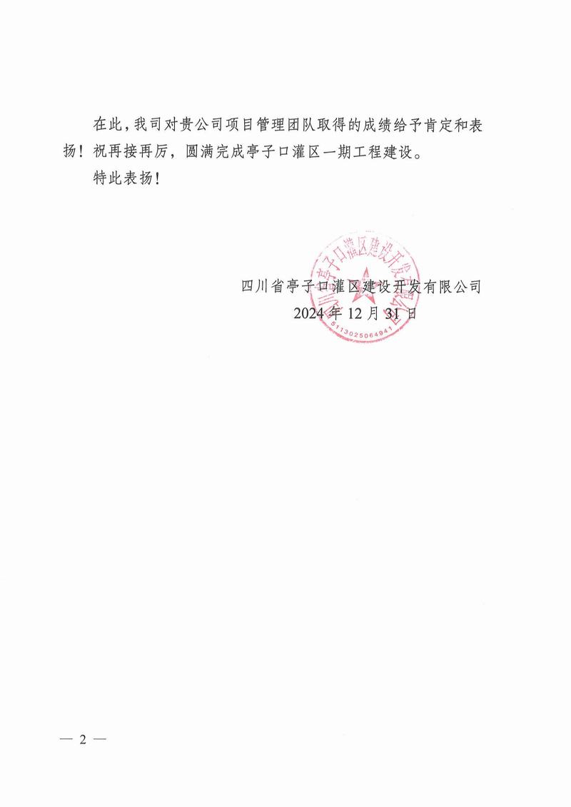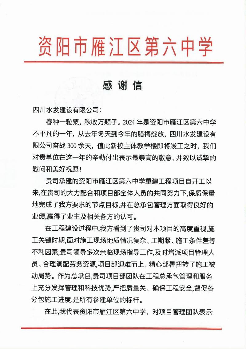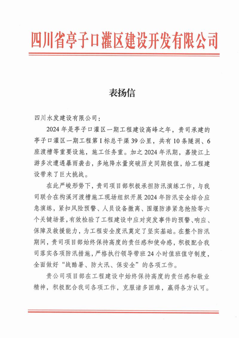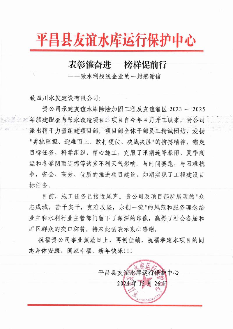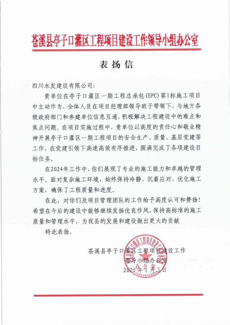 亭子口項目收到蒼溪縣亭子口灌區工程項目建設工作領導小組辦公室、四川省亭子口灌區建設開發有限公司發來的表揚信;資陽市雁江區第六中學重建工程項目收到資陽市雁江區第六中學發來的感謝信;平昌縣友誼水庫除險加固工程及友誼灌區2023—2025年續建配套與節水改造項目收到平昌縣友誼水庫運行保護中心的表揚信;萬源市城鄉一體化工程建設項目收到萬源市萬寶源水務投資開發有限公司發來的感謝信。